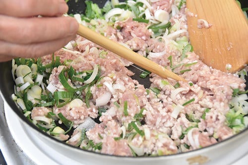 (2)フライパンにサラダ油を熱し、(1)の生姜を炒め、香りが立ったら鶏ひき肉を入れて炒める。肉の色が変わったら、長ネギを加え、さっと炒め合わせる。